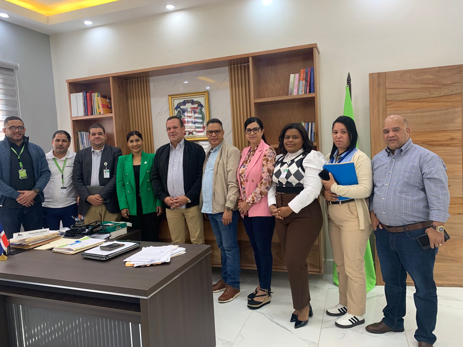 En el día de hoy, el alcalde municipal Francisco Marte, acompañado de la vicealcaldesa Belkis Victoriano, el Lic. Wady Brea, miembro del Consejo Presidencial, y la encargada de Recursos Humanos del ayuntamiento, Martina Valenzuela, recibieron una comisión de SENASA.