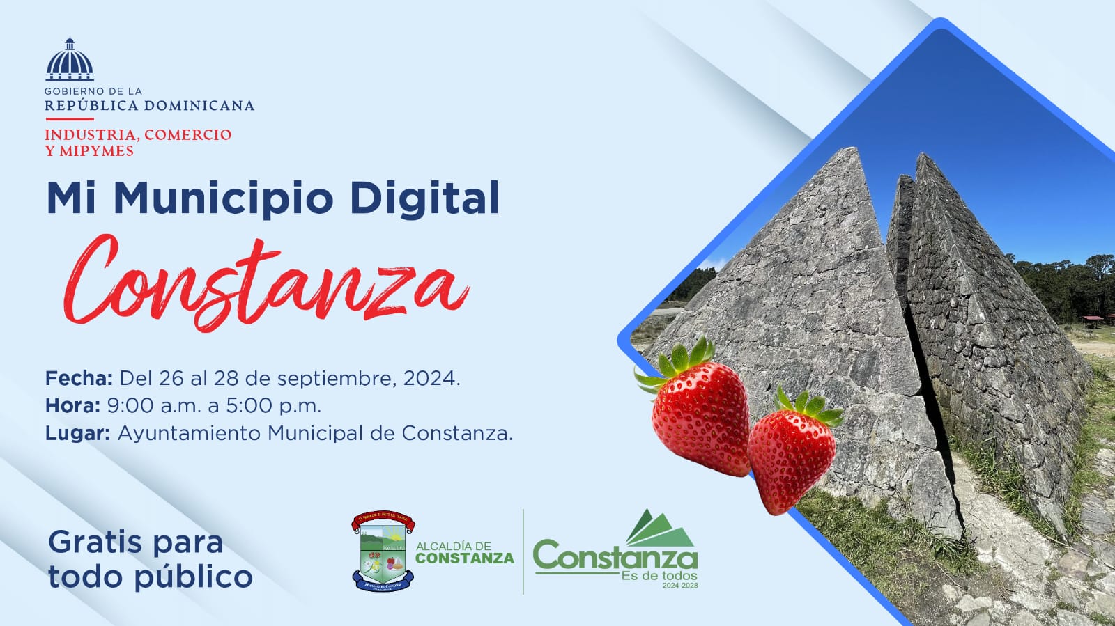 El Ayuntamiento de Constanza, a través de su Unidad de Planificación y Programación Municipal, presenta el programa *»Mi Municipio Digital»*, una iniciativa gratuita que se llevará a cabo del 26 al 28 de septiembre. Este programa es liderado por la División de Economía Digital de la DISAM del Viceministerio de Fomento a las Mipymes.