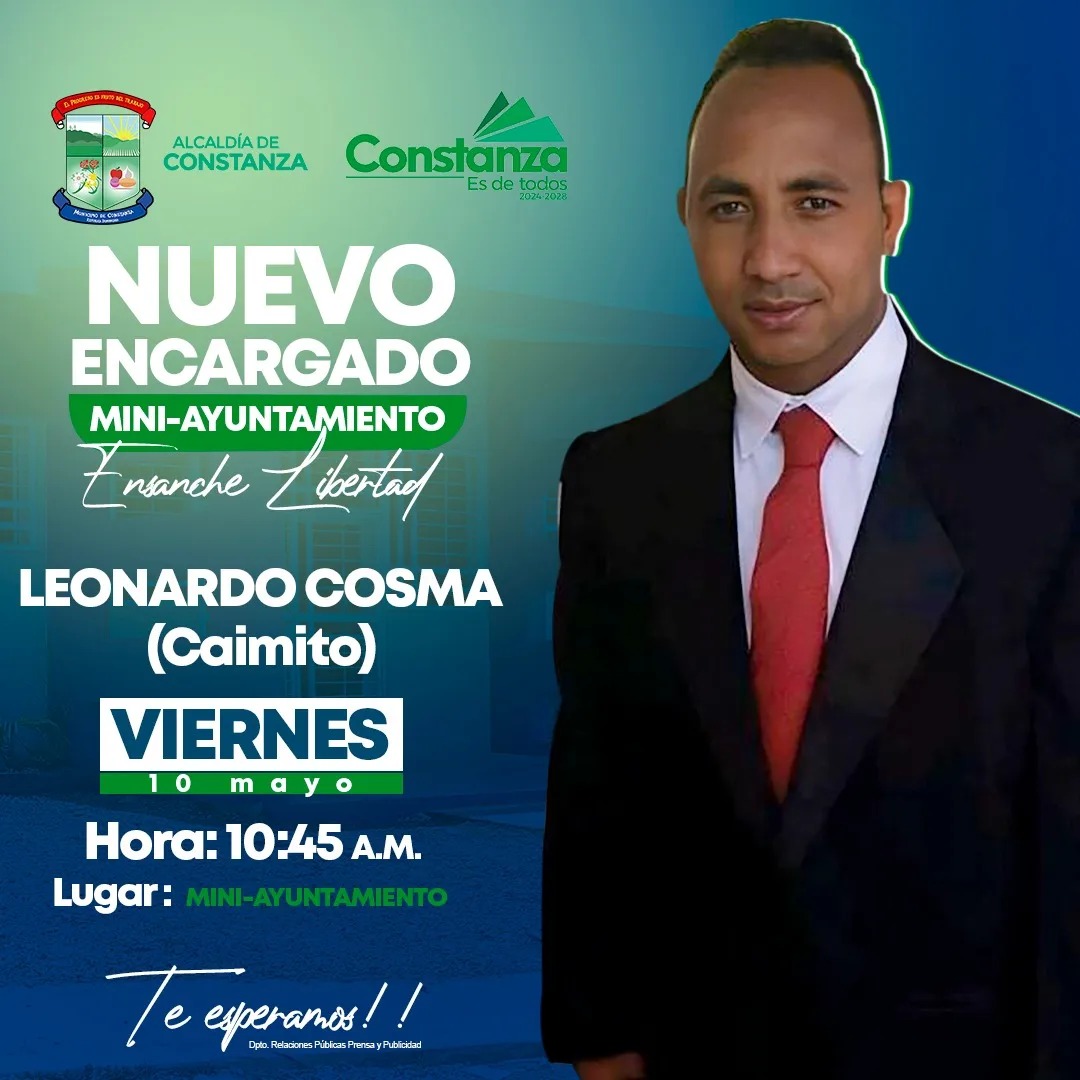 El Ayuntamiento del Municipio de Constanza, su alcalde Francisco Marte (Kiko) y el Concejo de Regidores, invitan a la toma de posesión del nuevo encargado del Mini Ayuntamiento del Ensanche Libertad.
