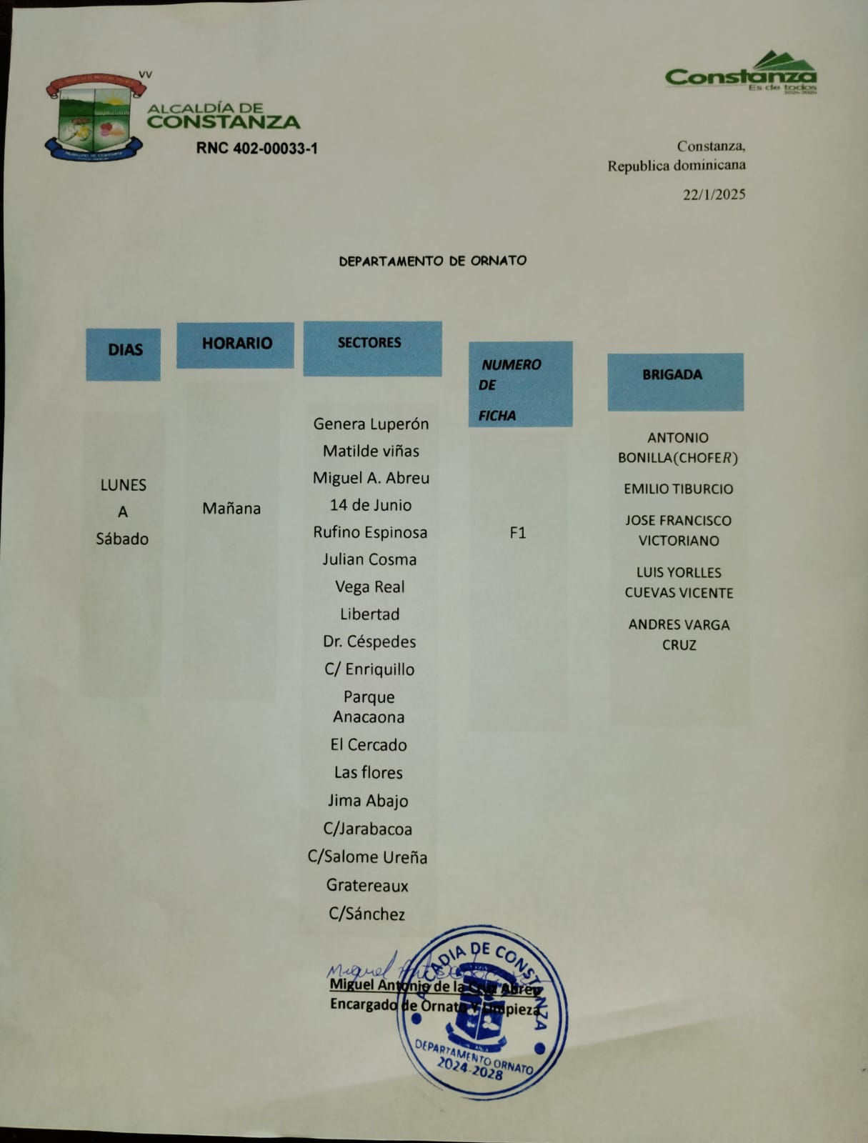 Rutas y Frecuencia de barrido de parques y calles del Municipio Constanza.