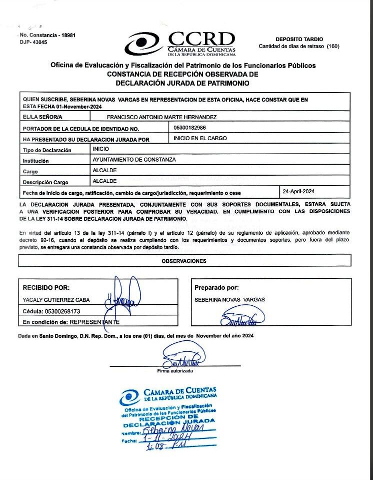 Maximo Santos (Regidor) Descargar 2.20MB Fecha de subida: 5 agosto, 2025 Declaración jurada Eugenia Hernández (Regidora) Descargar 315.78KB Fecha de subida: 16 junio, 2025 Declaración Jurada de Deyanira Duran Enc. Compras Descargar 248.01KB Fecha de subida: 16 junio, 2025 Declaración Jurada de Luis Camilo Tesorero Municipal Descargar 238.08KB Fecha de subida: 16 junio, 2025 Nancy Suriel (Regidora ) Descargar 557.52KB Fecha de subida: 2 diciembre, 2024 Declaración Jurada Ramona Victoriano Descargar 311.88KB Fecha de subida: 26 noviembre, 2024 Declaración-Jurada-Francisco-Marte-Alcalde. Descargar 124.11KB Fecha de subida: 12 noviembre, 2024